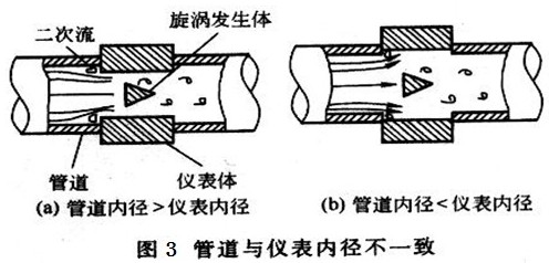 丙烷流量計與安裝管道內(nèi)徑也會存在誤差,或大或小,如圖3所示,當被測介質(zhì)經(jīng)過時,也會發(fā)生二次流動,對測量結(jié)果產(chǎn)生波動影響。