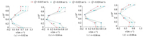 由圖5可知,當e相同時,斷面*小流速發(fā)生的位置相同,發(fā)生在浮體結(jié)構(gòu)下游回流區(qū)位置。隨著來流流量的增大,流經(jīng)浮體結(jié)構(gòu)下泄的水流流速在上層和下層水體中呈現(xiàn)增大的趨勢。浮體結(jié)構(gòu)位置不變,由于受到浮體結(jié)構(gòu)的擠壓,上游來流分別經(jīng)過浮體結(jié)構(gòu)上部、下部進行泄流,因此在下游區(qū)域的上層、下層水體中,流速較大;受浮體結(jié)構(gòu)的阻擋,浮體結(jié)構(gòu)下游區(qū)域形成回流區(qū),流速較小。試驗過程中,由于控制浮體結(jié)構(gòu)所在水域的上游、下游水位不發(fā)生變化,因此隨著來流流量的增大,流速呈現(xiàn)增大的趨勢。