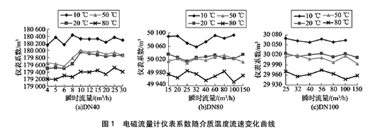 將實驗測得的水處理流量計在不同溫度及流速下的儀表系數數據整理,特性曲線如圖1所示,3組曲線分別對應DN40,  DN80,  DN100的3塊水處理流量計的儀表系數曲線。