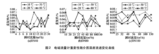 將實驗測得的水處理流量計在不同溫度及流速下的重復性數據整理,特性曲線如圖2所示,3組曲線分別對應DN40,  DN80,  DN100的3塊水處理流量計的重復性曲線。