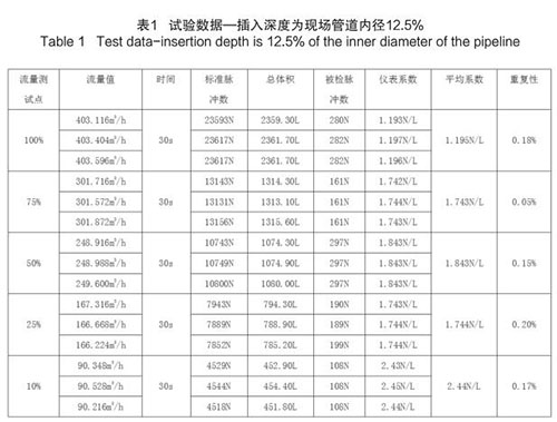 插入式煙氣流量計插入深度為現(xiàn)場管道內徑的 12.5%時,試驗數(shù)據(jù)如下(以 DN200 為例):
