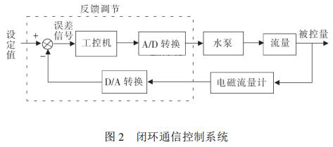 通信控制系統(tǒng)由工控機(jī)、變頻器、水泵、數(shù)據(jù)采集卡、化工污水流量計等組成。在整個熱量表耐久性試驗(yàn)裝置中,化工污水流量計與被試驗(yàn)熱量表串聯(lián)在試驗(yàn)管路中。系統(tǒng)設(shè)定流量值 qs,通過工控機(jī)發(fā)送信號給變頻器,來控制水泵運(yùn)轉(zhuǎn),系統(tǒng)通過研華數(shù)據(jù)采集卡 PCI1711 將采集到的化工污水流量計當(dāng)前瞬時流量值反饋給工控機(jī),工控機(jī)將返回流量值與設(shè)定流量值qs進(jìn)行比較,從而確定是否需要重新調(diào)整變頻器頻率控制水泵轉(zhuǎn)速。此過程是一個完整的閉環(huán) PID 控制過程,其閉環(huán)控制過程如圖 2 所示。 2. 2 管路切換系統(tǒng)管路切換主要由冷熱水箱、水泵、開關(guān)閥等組成。要實(shí)現(xiàn)熱量表耐久性 4000 次冷熱沖擊試驗(yàn),需要實(shí)時控制管路中熱水與冷水的交替使用。