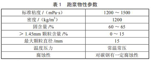 對跑漿進行分析后發現,跑漿是一種由煤漿和一些雜質混合而成的半流體物質,當蒸汽流量計使用煤倉中煤堆中上部煤時,由于煤質較好,跑漿中小煤塊極少,性質同正常煤漿,只是固含量稍高;而使用煤堆底部的煤時,煤質差蒸汽流量計研磨不充分,跑漿中含有約 15% 的小煤塊,分析后的跑漿物質參數如表 1 所示。