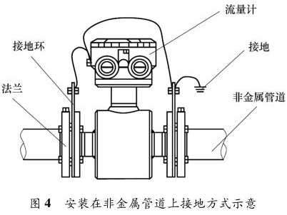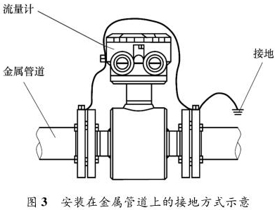 智能型防腐電磁流量計安裝在金屬管道上,安裝時將金屬管道與智能型防腐電磁流量計相連接,接地線再接入接地網,如圖 3 所示。
