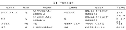 智能型防腐電磁流量計要根據被測流體的溫度、壓力、速度以及含固顆粒的硬度、含量和粒徑大小來決定測量管內襯的材質。該濕法磷酸裝置中,智能型防腐電磁流量計測量管襯里材質的種類見表 2。