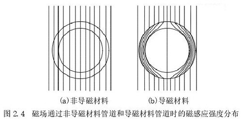 1.測量管:主要是傳感器的管道,該管道由高導(dǎo)電率非導(dǎo)磁材料制成,可保證流體在通過時(shí)能夠表現(xiàn)出自身的電磁效應(yīng),在該管道內(nèi)中安裝了內(nèi)襯。使用非導(dǎo)磁材料的原因是保證勵磁線圈中所產(chǎn)生的磁場不會順著管道流走,確保測量管道內(nèi)部產(chǎn)生明顯的磁感應(yīng)線,下圖 2.4 中展示了利用非導(dǎo)磁材料和導(dǎo)磁材料管道中所產(chǎn)生磁感應(yīng)線的情況。
