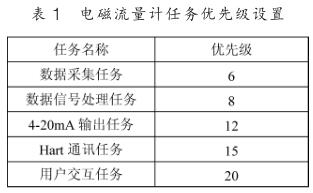 下面以電磁流量計為例說明基于  μC/OS-III 的人機界面設計。 先將  μC/OS-III 移植到 Cortex-M3 處理器上,這里選用的是 STM32F103VET6 。電磁流量計的應用程序若按照上節的任務種類劃分有: 數據采集任務、數據處理任務, 4~20mA輸出任務, Hart 通訊任務以及用戶交互任務。 先對不同的任務進行優先級的劃分,如表 1 所示。