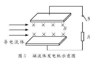 【例1】圖5為磁流體發(fā)電機示意圖。設(shè)兩金屬板間的距離為d,兩極板間勻強磁場的磁感應(yīng)強度為B。等離子體垂直進入磁場的速度為v,單個離子所帶的電荷量為q。離子通道(即兩極板內(nèi)所圍成的空間)的等效電阻為r,負載電阻為R。則下列判斷正確的是(  )