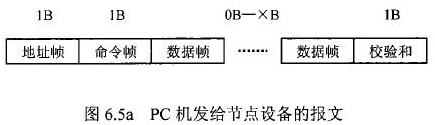 插入式電磁流量計等節(jié)點設備和C機通信的過程中,由地址幀、命令幀、數(shù)據(jù)幀、校驗和可組成各種功能不同的報文。由于采用主從工作方式來實現(xiàn)通信,插入式電磁流量計等節(jié)點設備僅能接收并執(zhí)行PC機發(fā)送來的控制命令,而不能發(fā)送命令給PC機。因此,由PC機發(fā)往流量計等節(jié)點設備的報文一般包括一個地址幀,一個命令幀,若干個數(shù)據(jù)幀和一個校驗和,其報文格式圖.6a5所示;而由流量計等節(jié)點設備發(fā)往PC機的報文一般包括一個地址幀,若干個數(shù)據(jù)幀和一個校驗和,其報文格式如圖6.5b所示。