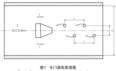 氣體渦輪流量計(jì)實(shí)現(xiàn)流量測(cè)量的理論基礎(chǔ)是流體力學(xué)中**的“卡門渦街”原理,在流動(dòng)的流體中裝置一個(gè)非線性三角柱形體,即渦旋發(fā)生體,如圖 1 所示。當(dāng)流體沿渦旋發(fā)生體繞流時(shí),會(huì)在渦旋發(fā)生體下游產(chǎn)生兩列不對(duì)稱,但有規(guī)律交替地分離釋放出一系列漩渦束,只有當(dāng)兩渦漩列之間的距離 h 和同列的兩渦漩之間的距離 L 之比滿足 h/L=0.281 時(shí),所產(chǎn)生的渦街才是穩(wěn)定的。
