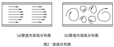 當(dāng) Re > Rec 時(shí),管道內(nèi)流體為湍流(湍流是流體的不規(guī)則運(yùn)動(dòng),流場(chǎng)中各種量**間和空間坐標(biāo)發(fā)生紊亂地變化),如圖 2(b)所示。