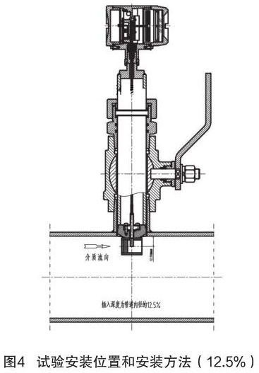 根據(jù)中華人民共和國(guó)機(jī)械行業(yè)標(biāo)準(zhǔn):JB/T9249-2015《煙氣流量計(jì)》進(jìn)行氣體渦輪流量計(jì)的研制與設(shè)計(jì)。在試驗(yàn)過程中,因?yàn)槔碚撗芯坎怀浞郑偌由辖?jīng)驗(yàn)不足,采用插入深度是按照以往其它產(chǎn)品(插入式電磁流量計(jì))的經(jīng)驗(yàn),以插入深度為現(xiàn)場(chǎng)管道內(nèi)徑的 12.5% 進(jìn)行試驗(yàn),其對(duì)介質(zhì)流量的檢測(cè)值與同種規(guī)格管道法蘭式結(jié)構(gòu)的煙氣流量計(jì)進(jìn)行比較,偏差值較大、儀表準(zhǔn)確度無法滿足設(shè)計(jì)要求。試驗(yàn)安裝位置和安裝方法如圖 4 所示。