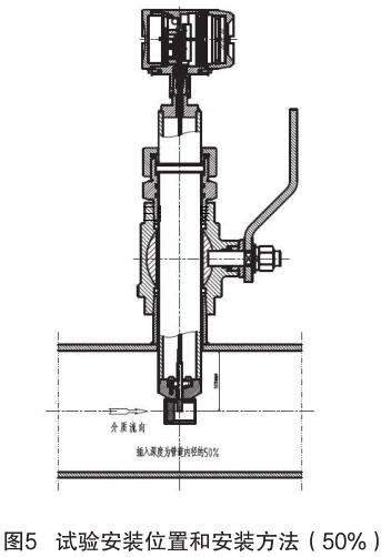 對(duì)氣體渦輪流量計(jì)和插入式電磁流量計(jì)的結(jié)構(gòu)原理進(jìn)行分析,插入式電磁流量計(jì)的信號(hào)采集點(diǎn)在標(biāo)校管道內(nèi)12.5% 為宜,因它屬電磁類流量計(jì),而煙氣流量計(jì)是根據(jù)“卡門渦街”原理進(jìn)行測(cè)量管道內(nèi)流量,根據(jù)標(biāo)校管道內(nèi)層流和湍流的分析,以及氣體渦輪流量計(jì)獨(dú)特的探頭結(jié)構(gòu)形式,確定氣體渦輪流量計(jì)的插入深度為標(biāo)校管道內(nèi) 50%,試驗(yàn)安裝位置和安裝方法如圖 5 所示。