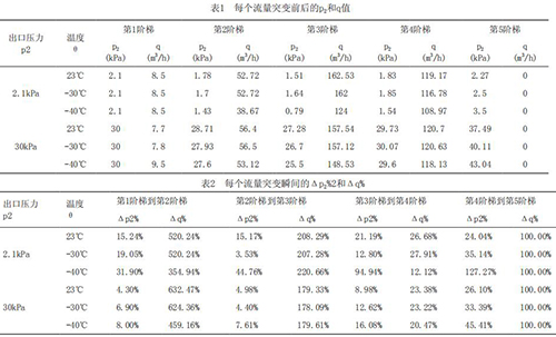 為了深入研究溫度及流量突變對(duì)分體式電磁流量計(jì)響應(yīng)速度的影響趨勢(shì),把每個(gè)流量突變點(diǎn)前后的出口壓力p2,流量q列表如表1所示。