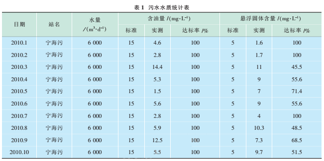 以一礦為例,2010年1~10月寧海污水站累計(jì)處理污水187萬(wàn)m,日均6200m。,110月份外輸污水含油累計(jì)達(dá)標(biāo)率100%,外輸懸浮物累計(jì)達(dá)標(biāo)率69.7%(見表1)。