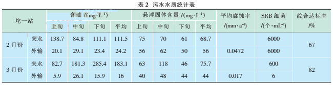 2011年2月坨一站來(lái)水含油平均183.1mg/L,外輸含油平均16mg/L,懸浮固體平均8.3mg/L,平均腐蝕率0.017m1m/a,SRB細(xì)菌平均6個(gè)/mL。只有懸浮固體含址超標(biāo)。